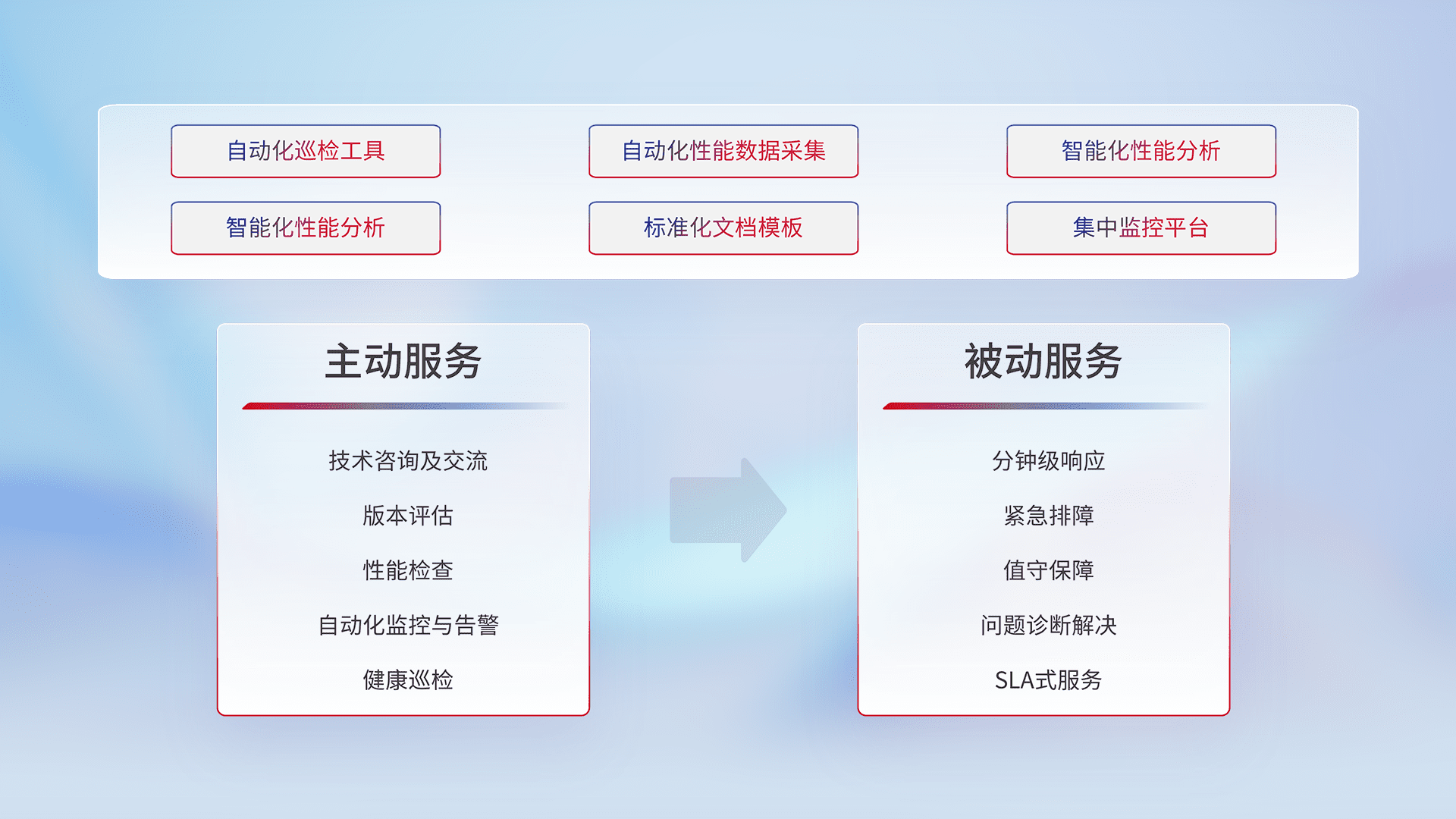 智能化工具和标准化文档,,,,保障服务质量,,提供主动服务(包含技术咨询、、、版本评估、、、、性能检查、、、、自动化监控与告警、、、健康巡检)和被动服务包含(分钟级响应、、、、紧急排障、、值守保障、、问题诊断解决、、、、SLA服务)。。